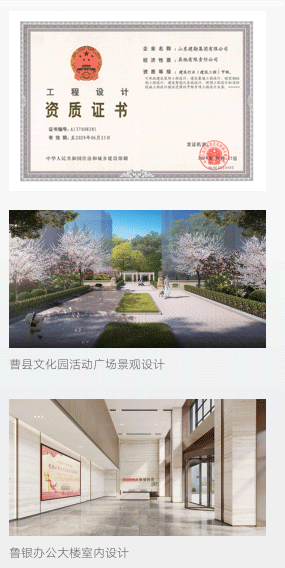 曹县文化园景观设计、天桥区高架桥桥下低线空间景观设计、蒙恬广场景观设计、鲁银办公大楼室内设计、周村新材料产业园室内设计、东阿县烈士陵园室内设计及华耀城幼儿园室内设计等多个景观、装饰类项目。